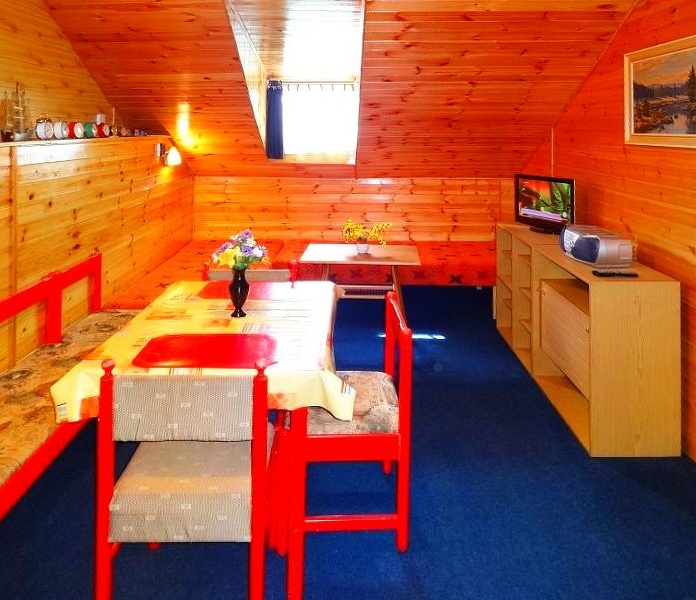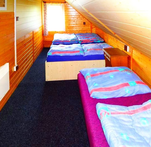 Hezké, vnitřek chaty je celý obložen dřevem, na podlahách jsou koberce, někde i dlažby. V chatě je 1x ložnice se třemi lůžky a 1x obývací ložnice se dvěma lůžky, kde je i jídelní stůl, krbová kamna a televize, dále je zde samostatná vybavená kuchyňka, koupelna se sprchovým koutem a wc.